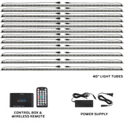 The included control box features 7 Solid Color Modes, 1 Color Cycle Mode, Million Color Fade Mode, 1 Color Scan Mode, 4 Brightness levels, 3 Speed modes for the Color Cycling and Color Fading effects, and 1 Music Mode which allows the LEDs to flash and strobe to music. The Solid Color Modes are White, Red, Green, Blue, Yellow, Purple and Teal. With Million Color Fade Mode you can scroll through a nearly unlimited number of variations in the shading of each solid color. Any of these lighting options can be easily selected with the included wireless remote, which also powers the kit and allows you to save your favorite colors to 7 different memory buttons. The remote also changes the shade of each solid color.