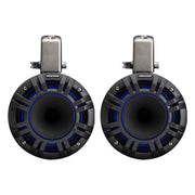 The enclosures are constructed from UV-resistant polymer to handle extreme sun and marine environments. Built-in LED lighting adds visual impact and can be upgraded with the optional KICKER LED remote for access to 20 colors and 19 lighting modes. A 354-degree swivel mount allows flexible sound positioning, while the stainless-steel mounting clamps provide strength and security.