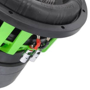 Structurally, the subwoofer is housed in a green textured die-cast aluminum basket, offering superior strength, vibration resistance, and long-term reliability. Dual mirrored black spiders stabilize cone movement under heavy load, while 4-gauge copper push terminals ensure secure, high-current electrical connections for large amplifiers and upgraded electrical systems.