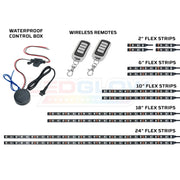 - Includes (4) 2", (2) 6", (2) 10", (2) 18" & (2) 24" Flexible Lighting Strips that House 180 SMD LEDs, Waterproof Control Box, 2 Wireless Remotes, Motorcycle Strip Power Harness, 3' of Wire per Strip, Alcohol Prep Pads, Adhesion Promoter & Zip Ties